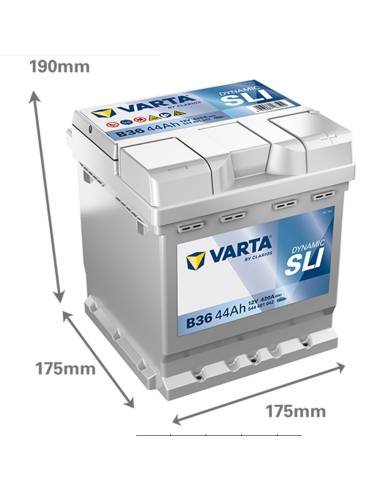 La Batería B36 Varta de la gama Blue Dynamic cuenta con un pico de arranque de 420A. con una capacidad de 44Ah. Su dimensión es de 175x175x190 mm. Es una batería para el arranque de motores y es valida para muchos tipos de vehículos europeos.